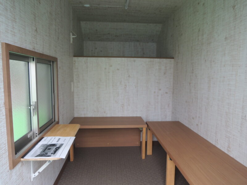 事務所は2人がPC操作できるスペースと書庫、冷蔵庫もついており、出ている机を収納すれば簡易ベッドにもなり、冷暖房完備のため熱中症などで倒れた人がいても休憩施設として利用できます。