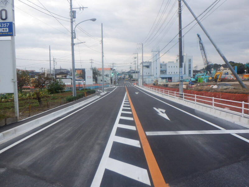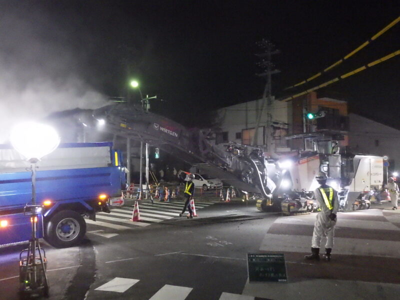 にも近く、大型車両が多い道路であり、近年人口の増加率が全国1位の流山市であることから付近は新規住居も多く、この県道は近隣の方の主要道路でしたので一般車両の往来も多く、昼間は大渋滞が予想されることから夜間での施工でした。