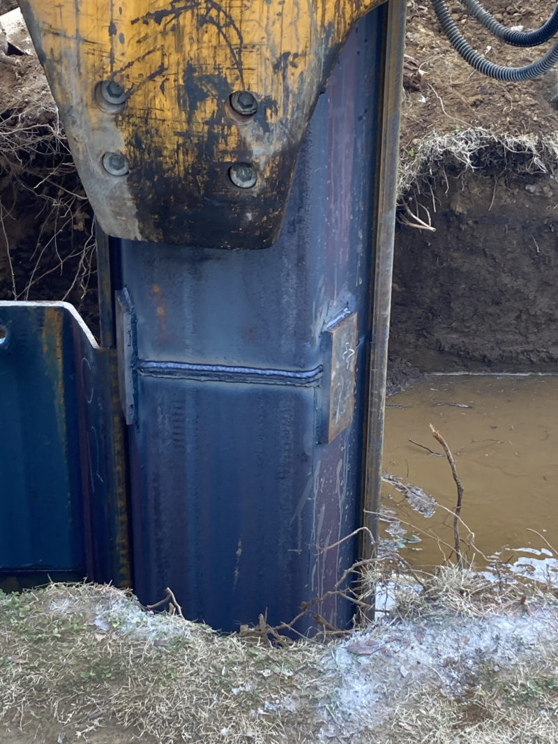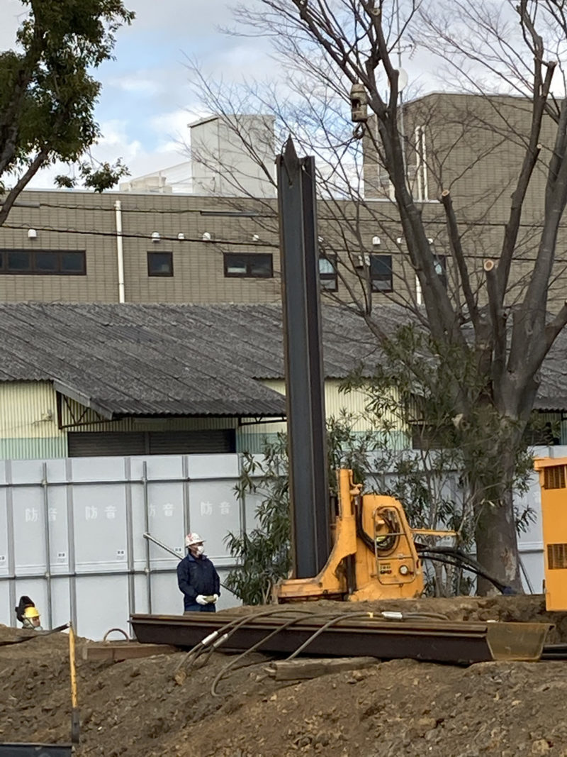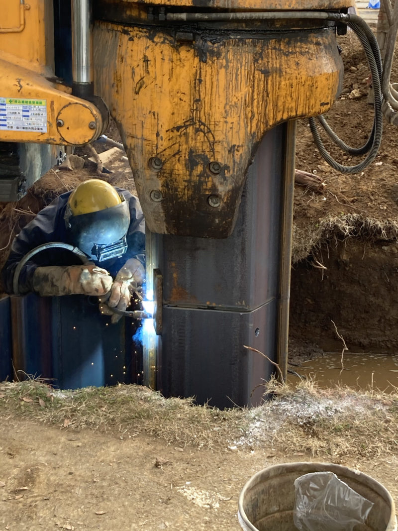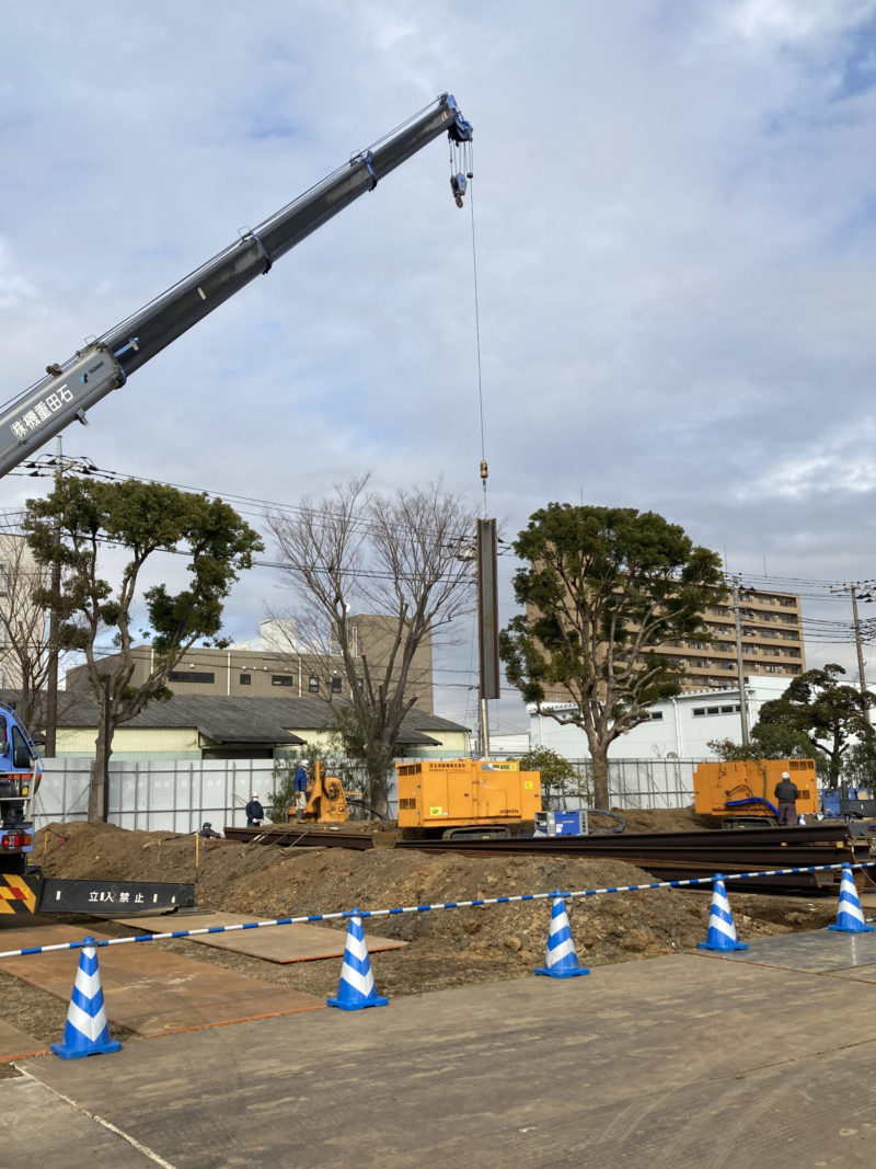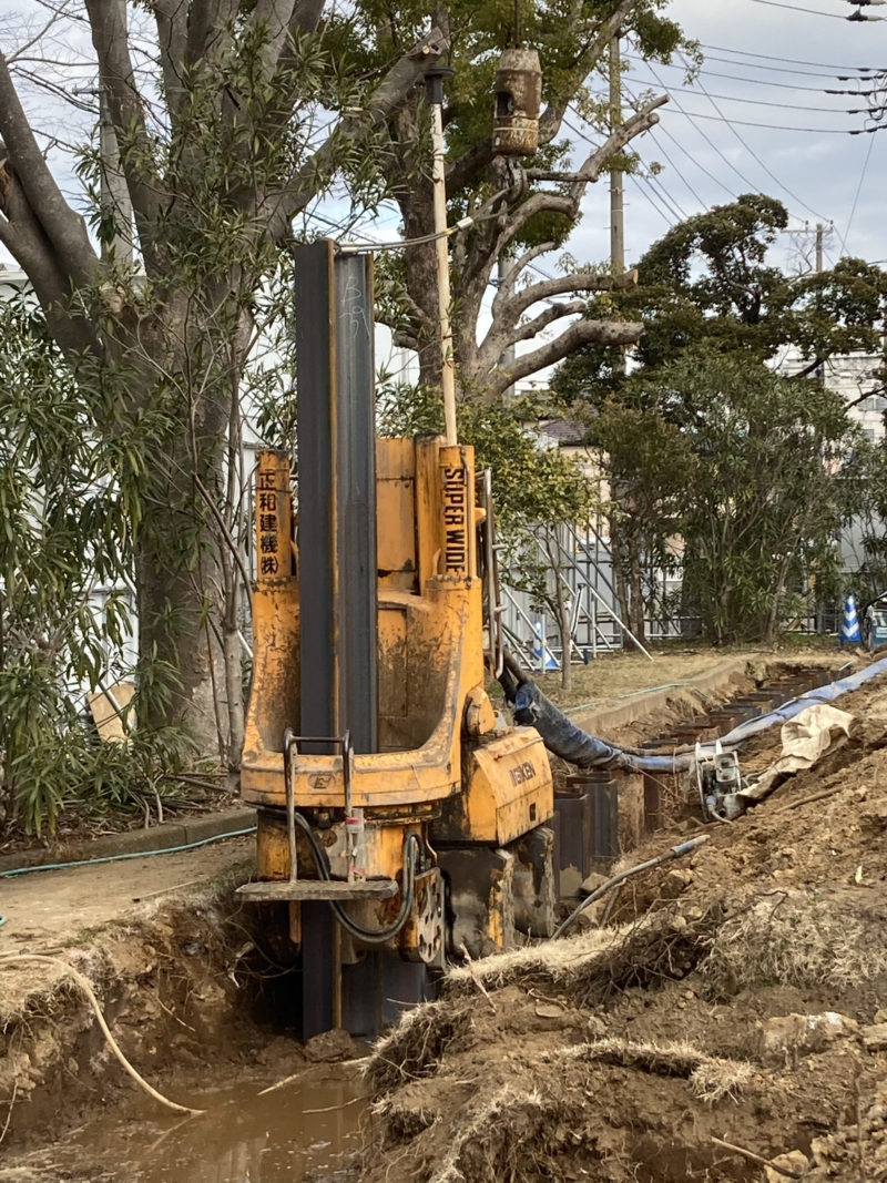 鋼矢板と言われるものを地中に連結させながら打込み鉄の箱をつくります。