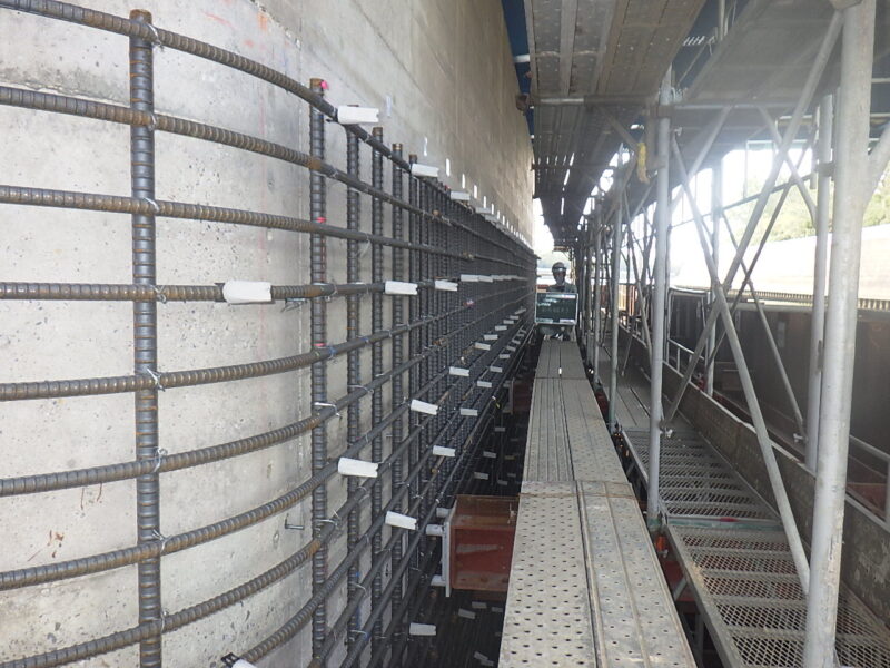 圧接ですが、今回工事ではコンクリート厚が25㎝しかないため、主鉄筋を圧接で行いますと丸い球ができてしまい、その分コンクリートの充填性が悪くなり品質不良を起こす可能性があったので本工事ではエンクローズ溶接での継手を採用しました。