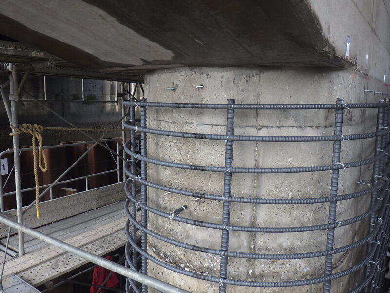 しかし橋脚の補強では、厚みがないため、鉄筋端部にフックを設けることができないため、結束力が強いフレアー溶接継手を採用します。